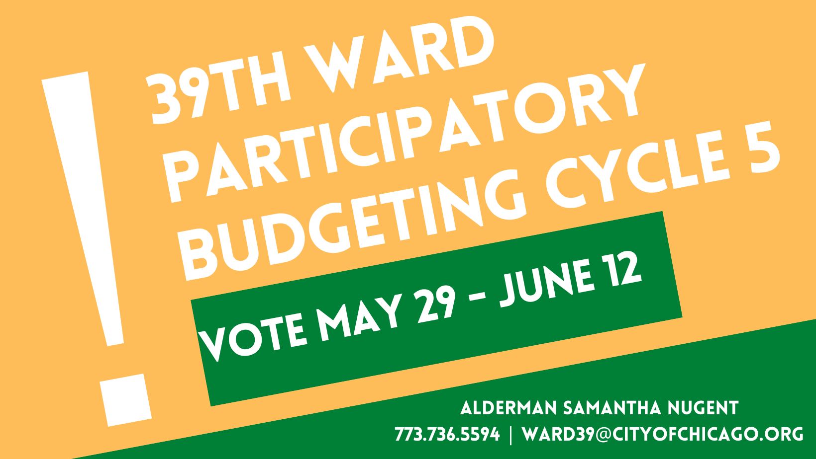 Visit https://aldermannugent.com/ to subscribe to Alderman Nugent’s newsletter and learn about what she’s doing for the 39th Ward. My office is open Mondays from 9am to 7pm, Tuesdays, Wednesdays, and Thursdays from 9am to 5pm and Fridays from 9am to 3pm. While the office is open for walk-ins, appointments are encouraged. We ask that everyone, regardless of vaccination status, wear a mask and maintain social distancing. Please reach out should you have any questions, comments, or concerns at 773-736-5594 or via email at Ward39@CityOfChicago.Org.